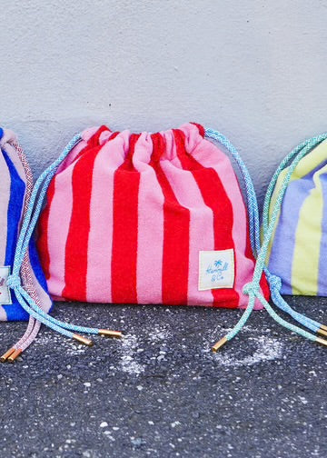 Made from soft terry towelling in bold red and pink stripes, it’s the perfect grab-and-go accessory for beach days! Lined in a natural cotton multi coloured polka-dots.