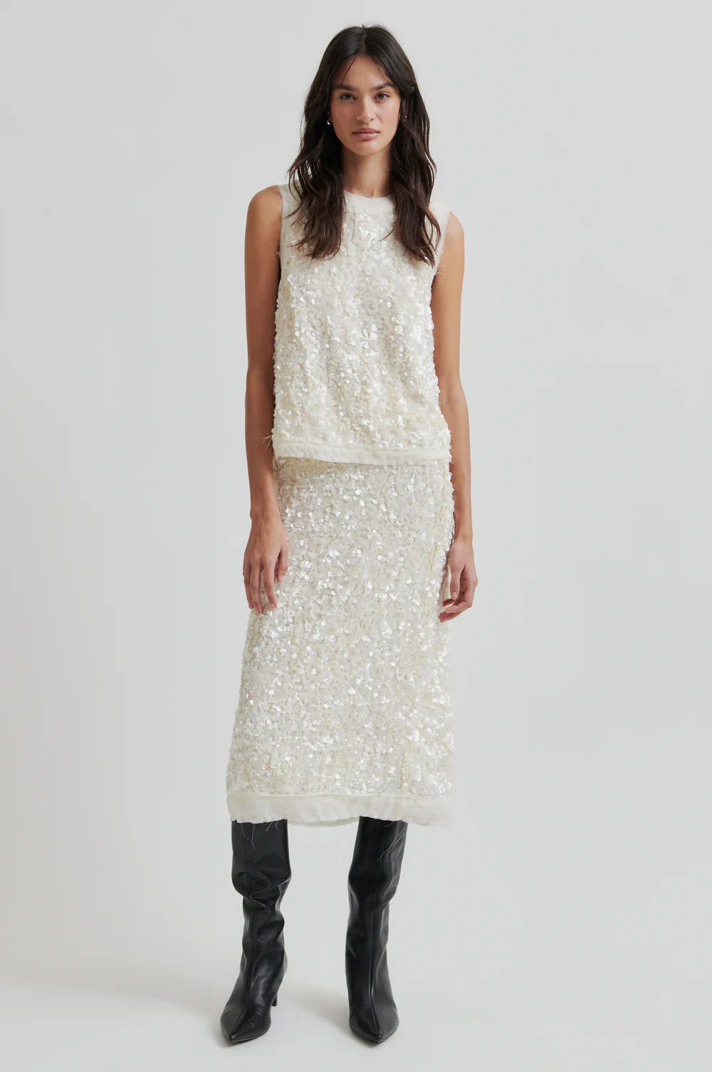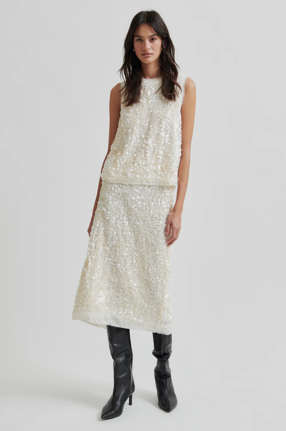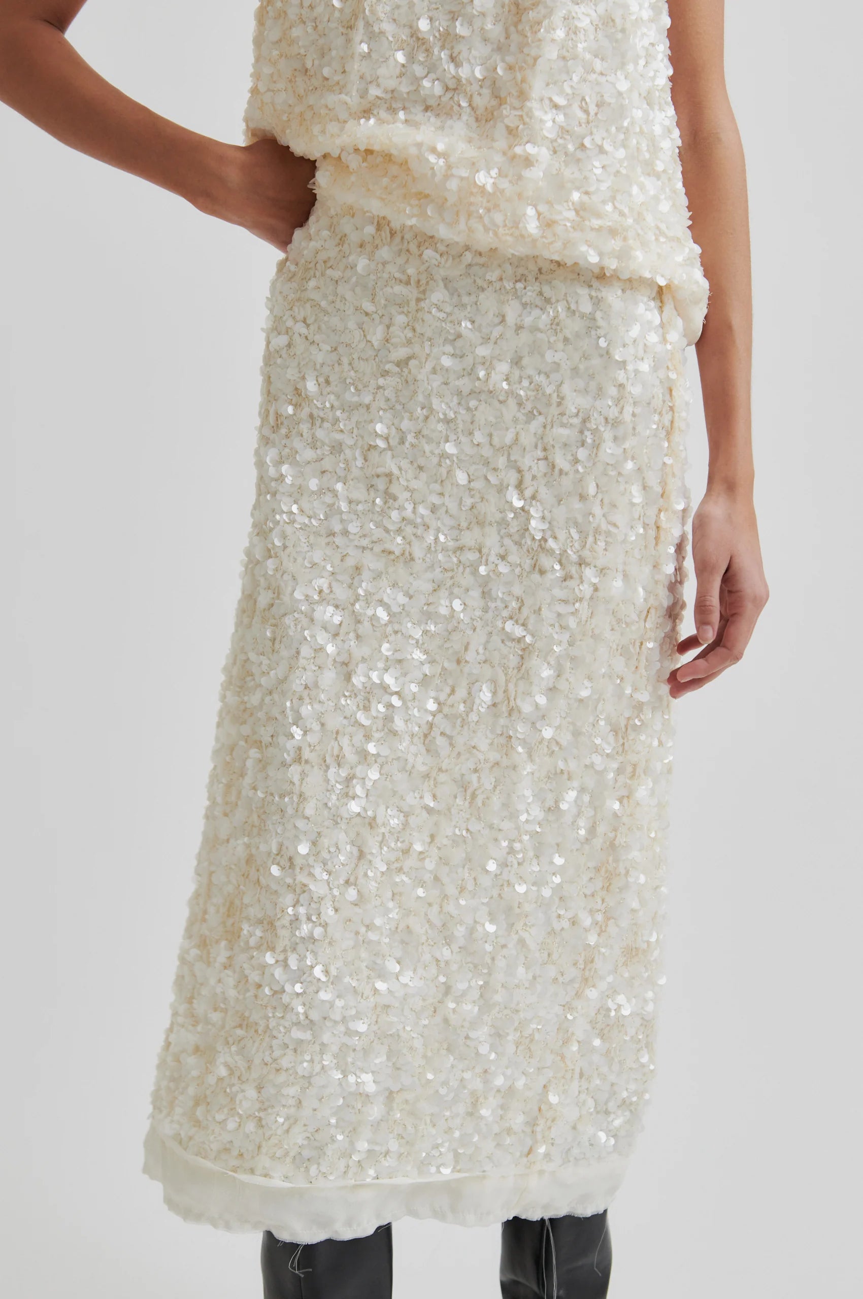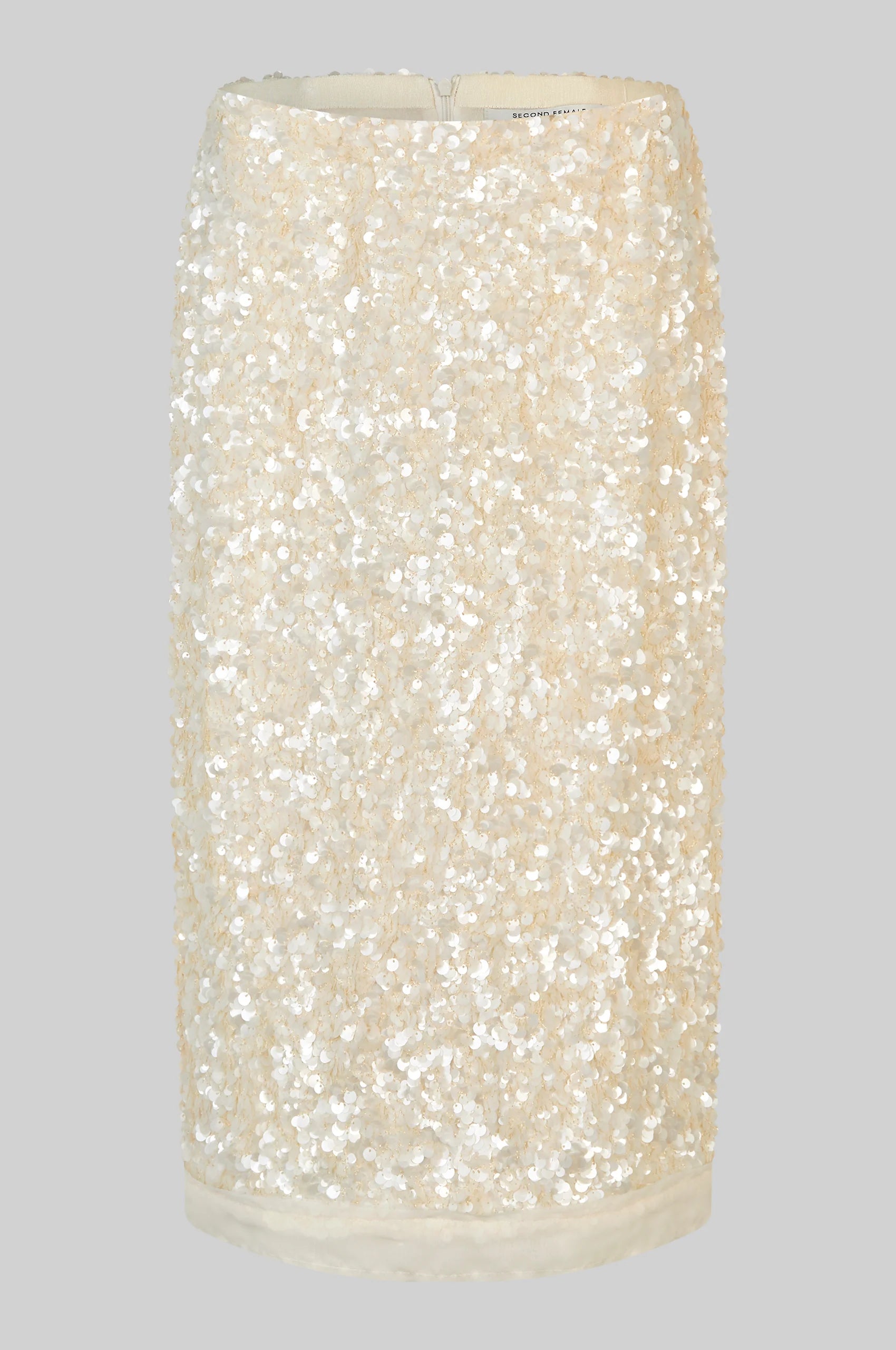 Second Female sequin pencil skirt. The skirt features different-sized sequins on a tonal background and a covered elasticated waistband. Visible lining at hem. Slit at one side. Fully lined. Slim, straight fit