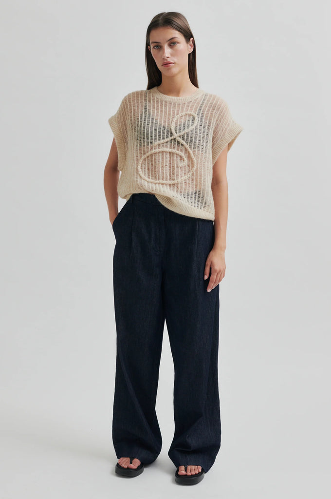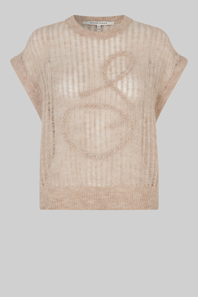 Second Female loose-knit vest. The vest is made in a super-soft and stretchy alpaca blend with delicate structured knit. Featuring a round neck, braided detail at the front and deep-cut armholes. Ribbed neck, armholes and bottom hem. Wide, slouchy fit.