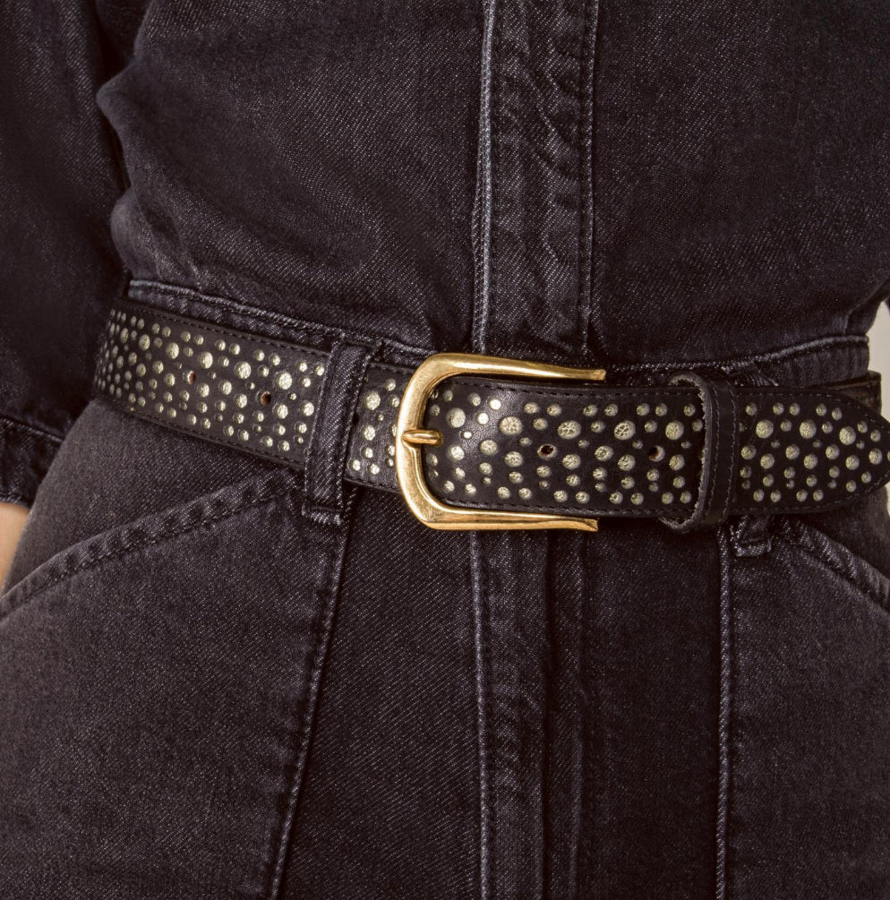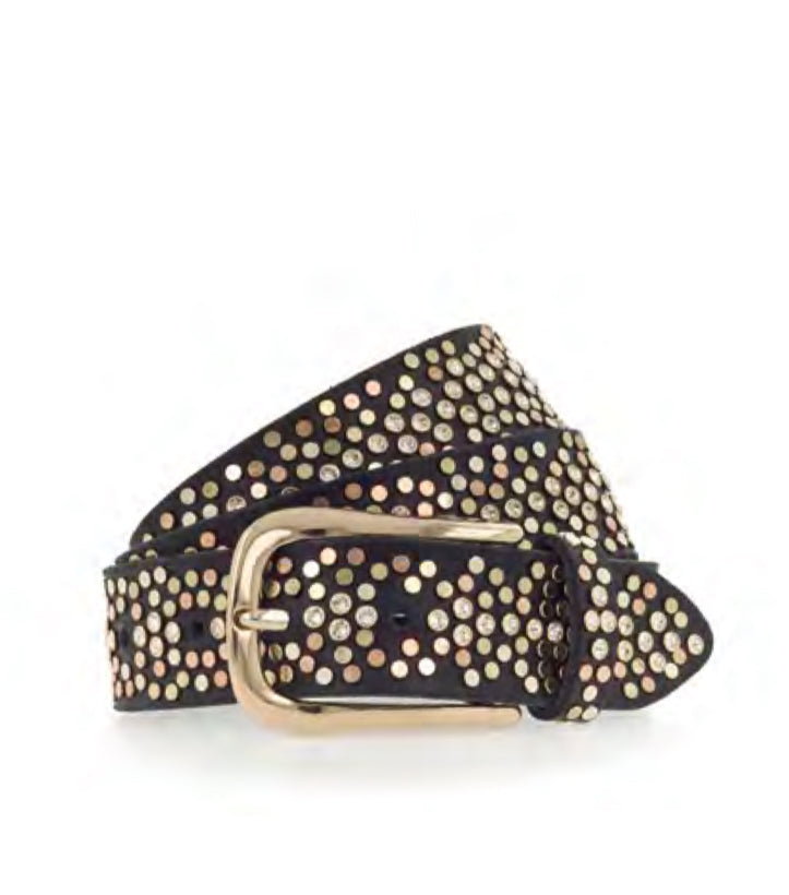 Black leather belt in 35 mm with airbrushed edges, crystal stones, mixed rivets and buckle in light gold.