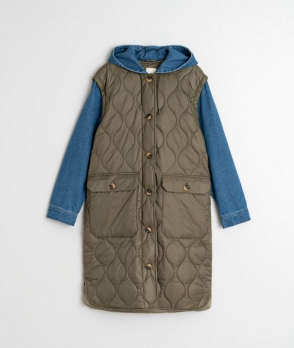 Quilted coat with contrasting combination fabric. It has a hood and a buttoned closure and slightly dropped shoulders with maxi patch pockets.