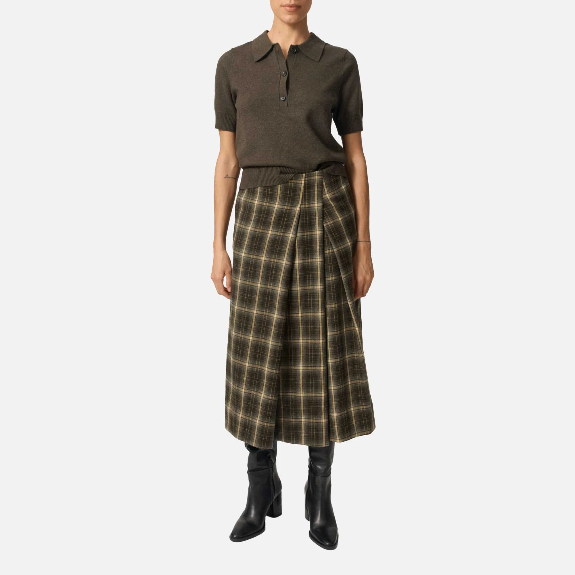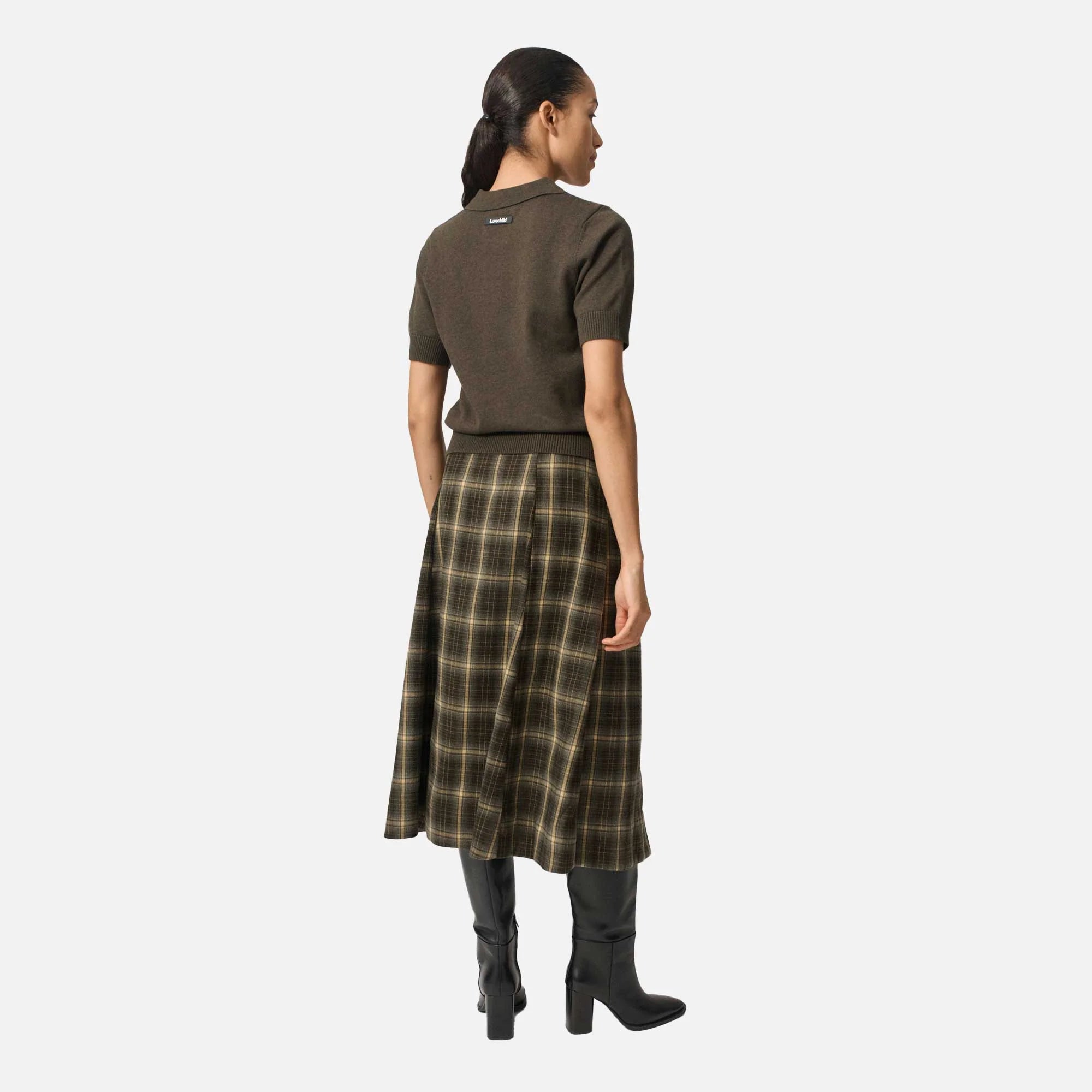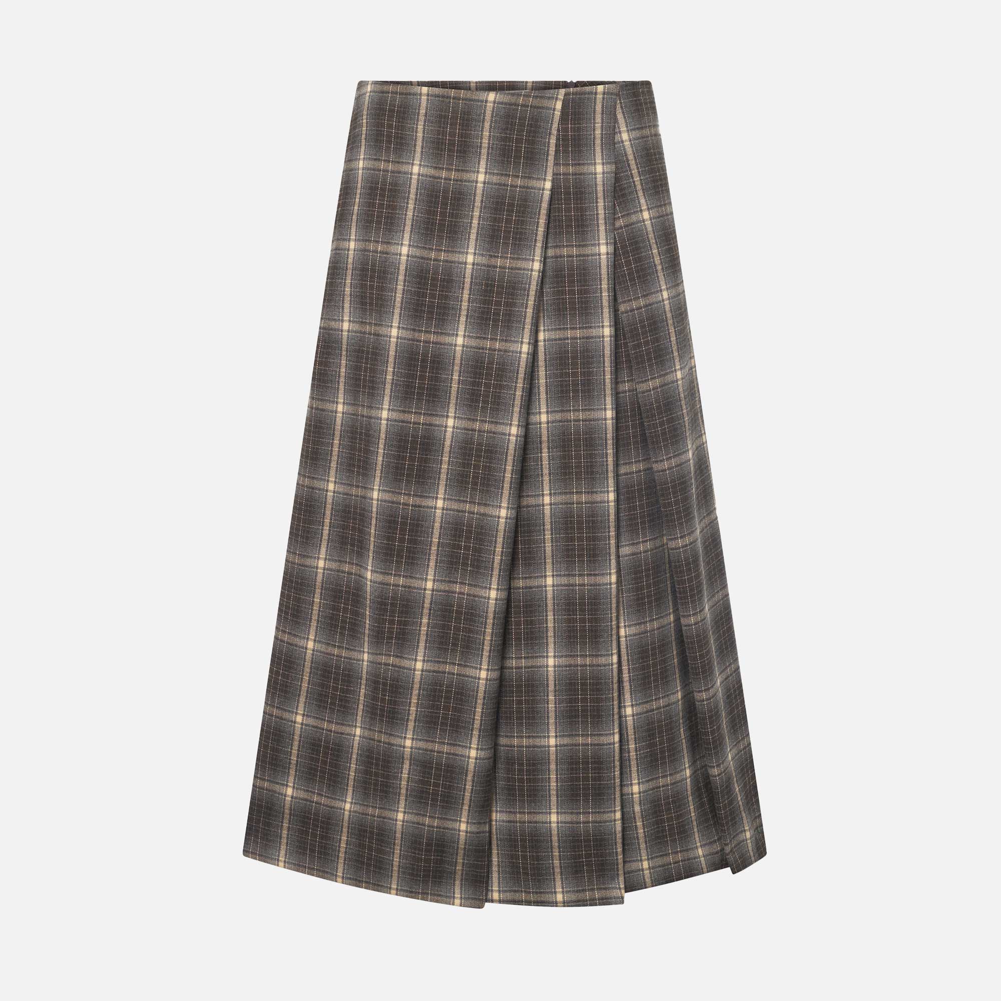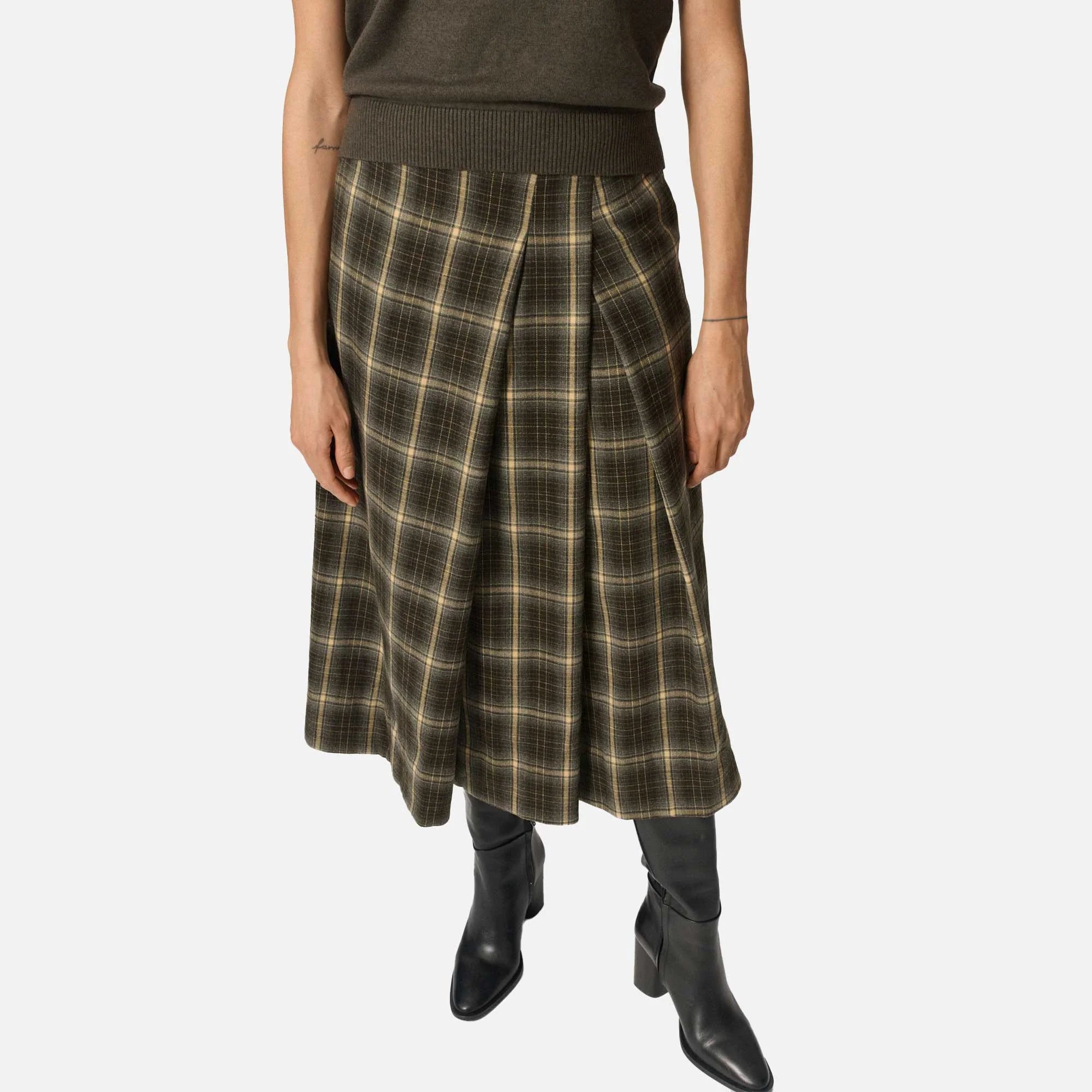 Skirt in green multi-check with a tailored fit that highlights the silhouette. The asymmetric pleat at the waist adds a modern touch, while the practical side pockets and the wide skirt ensure both comfort and freedom of movement.