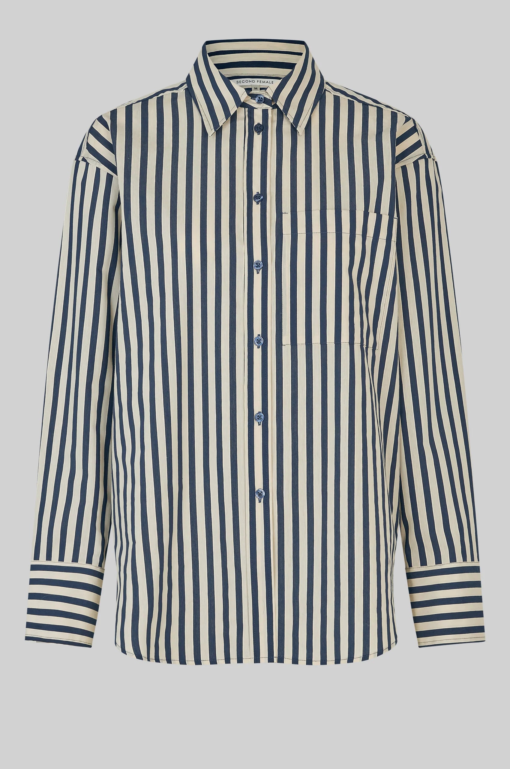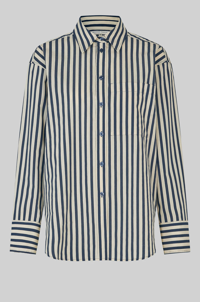 Second Female striped shirt. The shirt is made in a light and smooth cotton blend with all-over stripes. Featuring a regular collar, button-through fastening at the front and buttons at the sides. Long sleeves with buttoned cuffs. Shaped bottom hem. Loose fit.