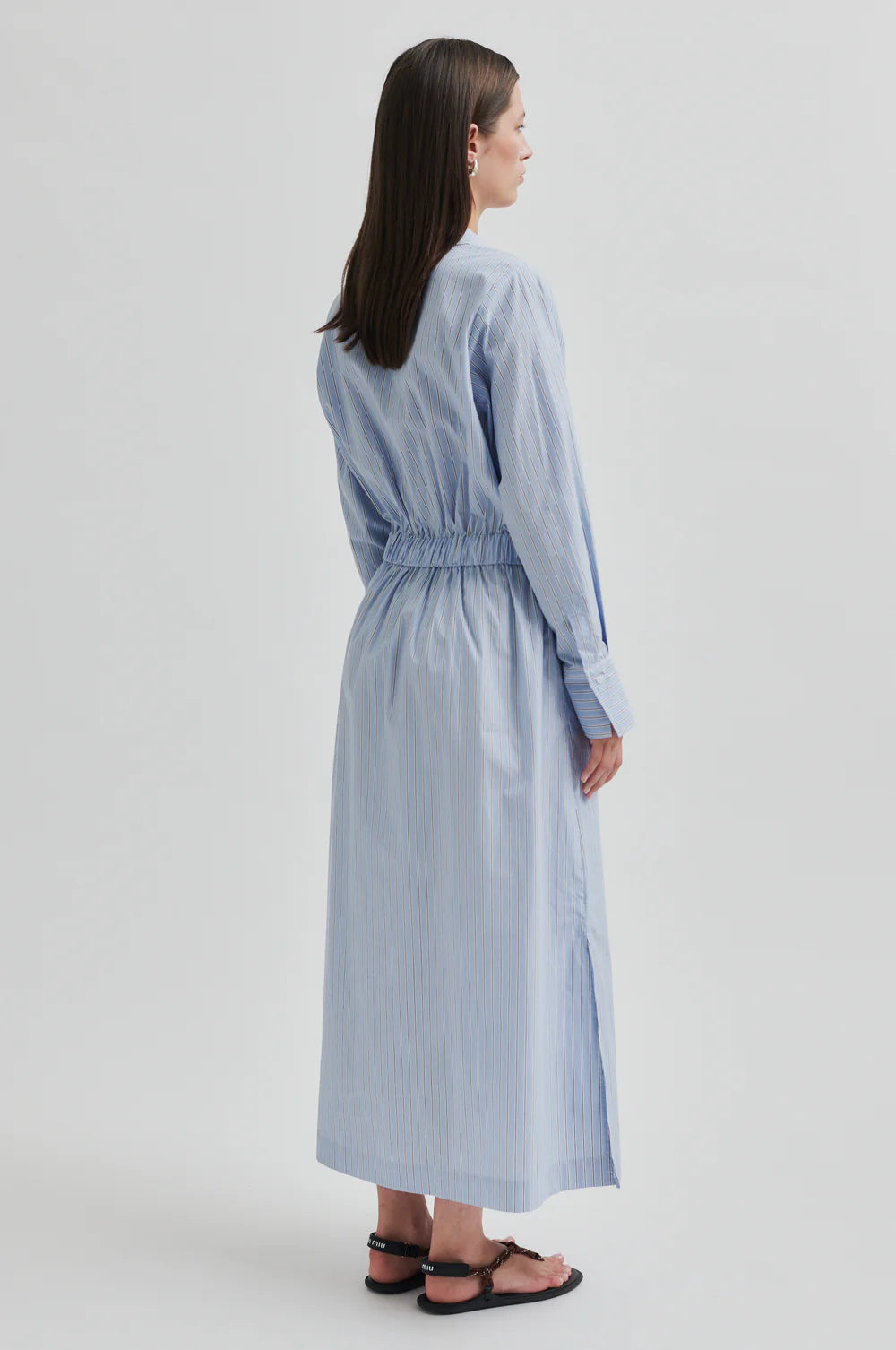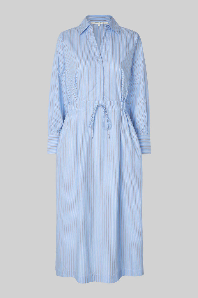 Second Female striped shirt dress. The shirt dress is made in light, smooth cotton with all-over stripes. Featuring a regular collar and concealed button fastening. Elasticated waist with drawstring tie. Long sleeves with buttoned cuffs. Slits at bottom hem. Regular fit at top with more volume in skirt.