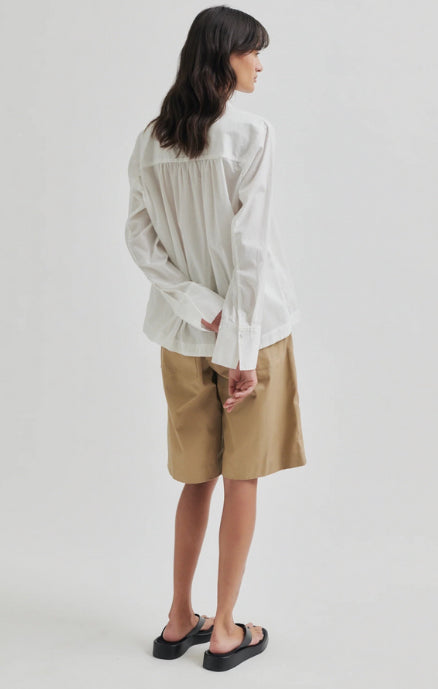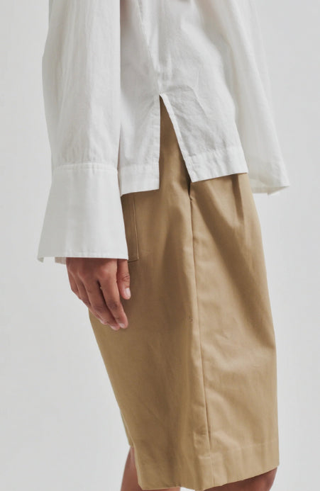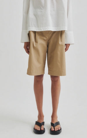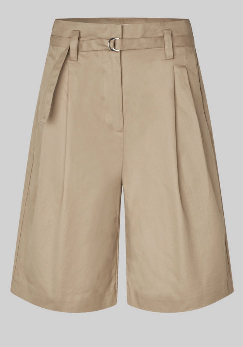 The shorts are made from thick organic cotton. They feature a concealed zip and hook-and-button closure at the front. Front pleats. Belt loops with a fabric belt and D-ring closure. Two slash pockets at the front and two patch pockets at the back. Mid-rise with straight legs.