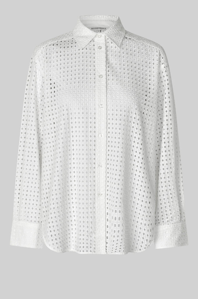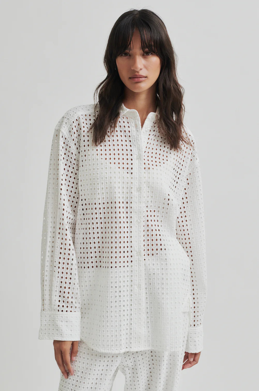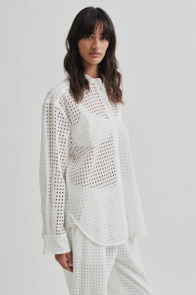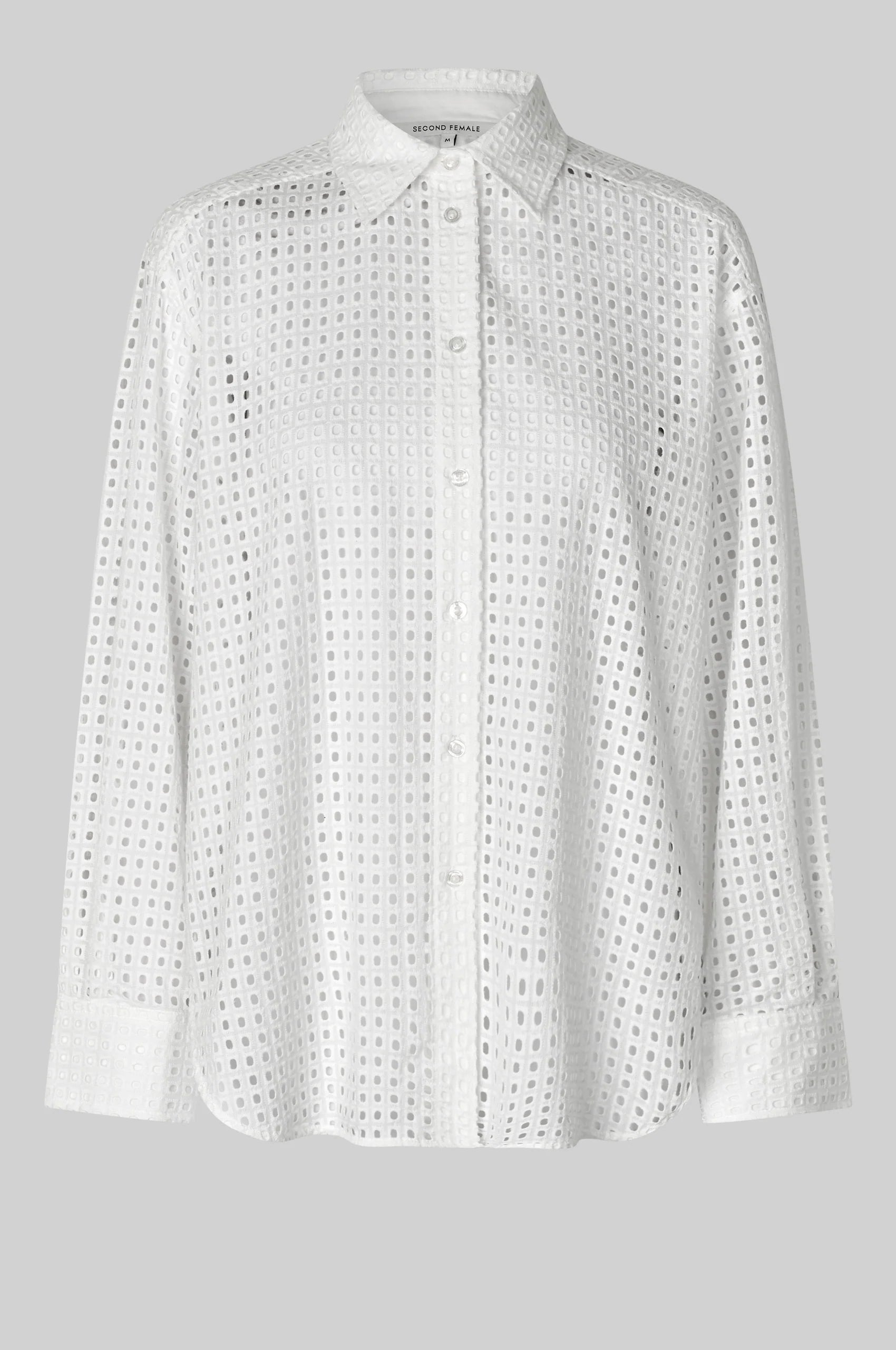 Second Female square-hole shirt. The shirt is made in light cotton with hole pattern. Featuring a placket with button-